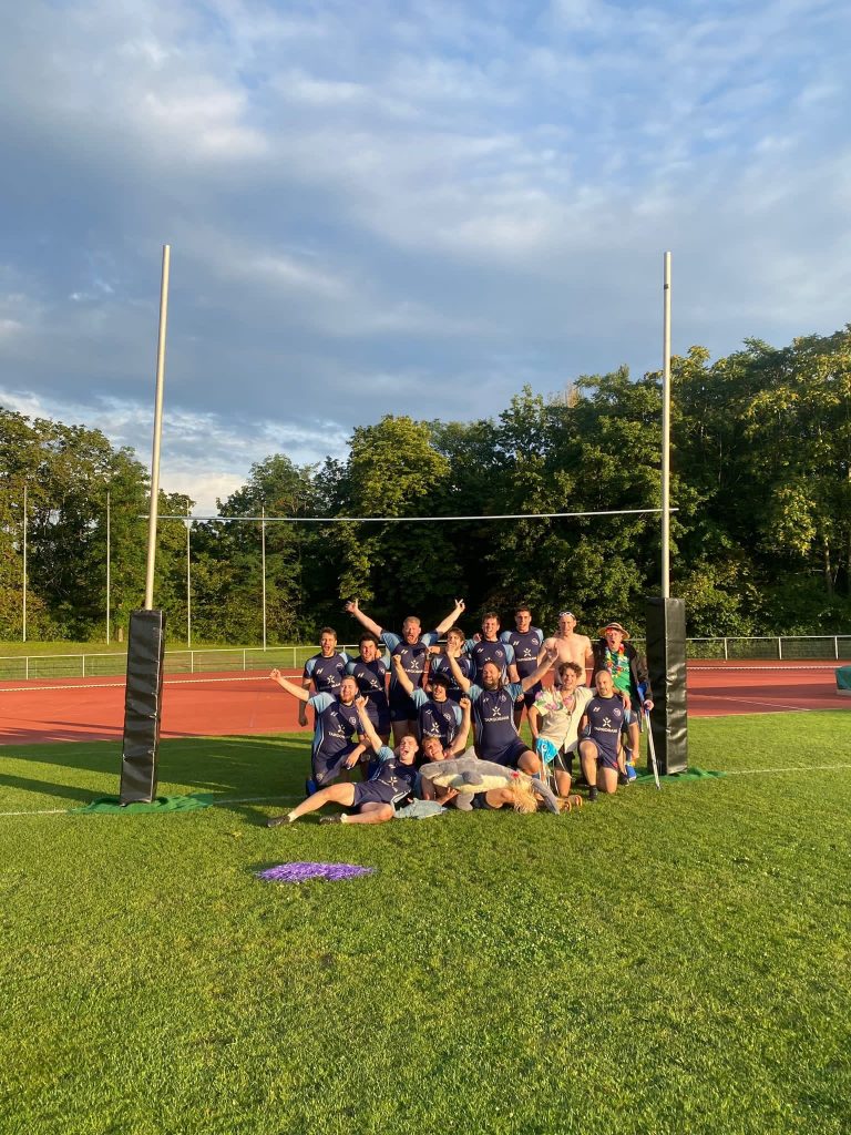 Two weekends ago the Fijian Flippers (aka Darmstadt‘s semi-unprofessional Rugby 7s team) headed down to the Kiliani 7s tournament. Wanting to make sure the boys were well rested and prepared for the tournament day, the team headed down on Friday night to Würzburg. After quickly erecting the tents, the boys changed into their traditional Fijian outfits and flower necklaces and the Flippers kicked off the pre-tournament preparation with some mimosas. Following several more cocktails and a number of games of shark attack, the Flippers faced their first „match“ of the tournament, being challenged by campsite neighbours Bad Reichenhall to a game of flunky ball. The Flippers promptly demolished Bad Reichenhall at Flunkyball, however the victory came at a high cost, as Bert‘s carrot was stolen and eaten by the Reichenhall women’s captain. Keen to make sure the team was well hydrated before the tournament, Philip (naturally) led the Flippers to a local watering hole for some refreshments. After much dancing, drinking, singing and more drinking, Simon selected himself as tour captain in the usual manner. After being dropped off by some taxis and a random local, the heavens began to open as the boys dashed to the tents, leaving Claas to crutch his way back in the rain.